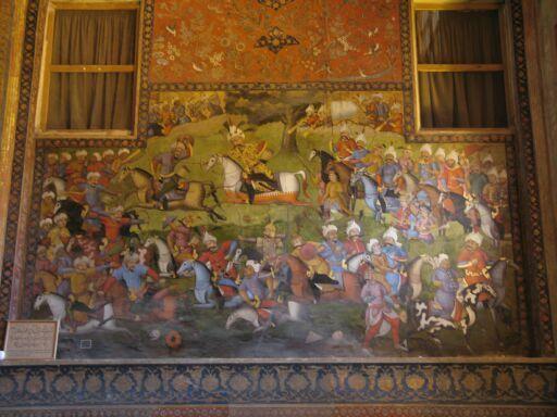 نقاشی تالار پادشاهی که تصویرشاهان صفوی بر آن نقش بسته است - تصویر شاهعباس اول با تاج مخصوص و مینیاتورهای اتاق گنجینه - سردر
